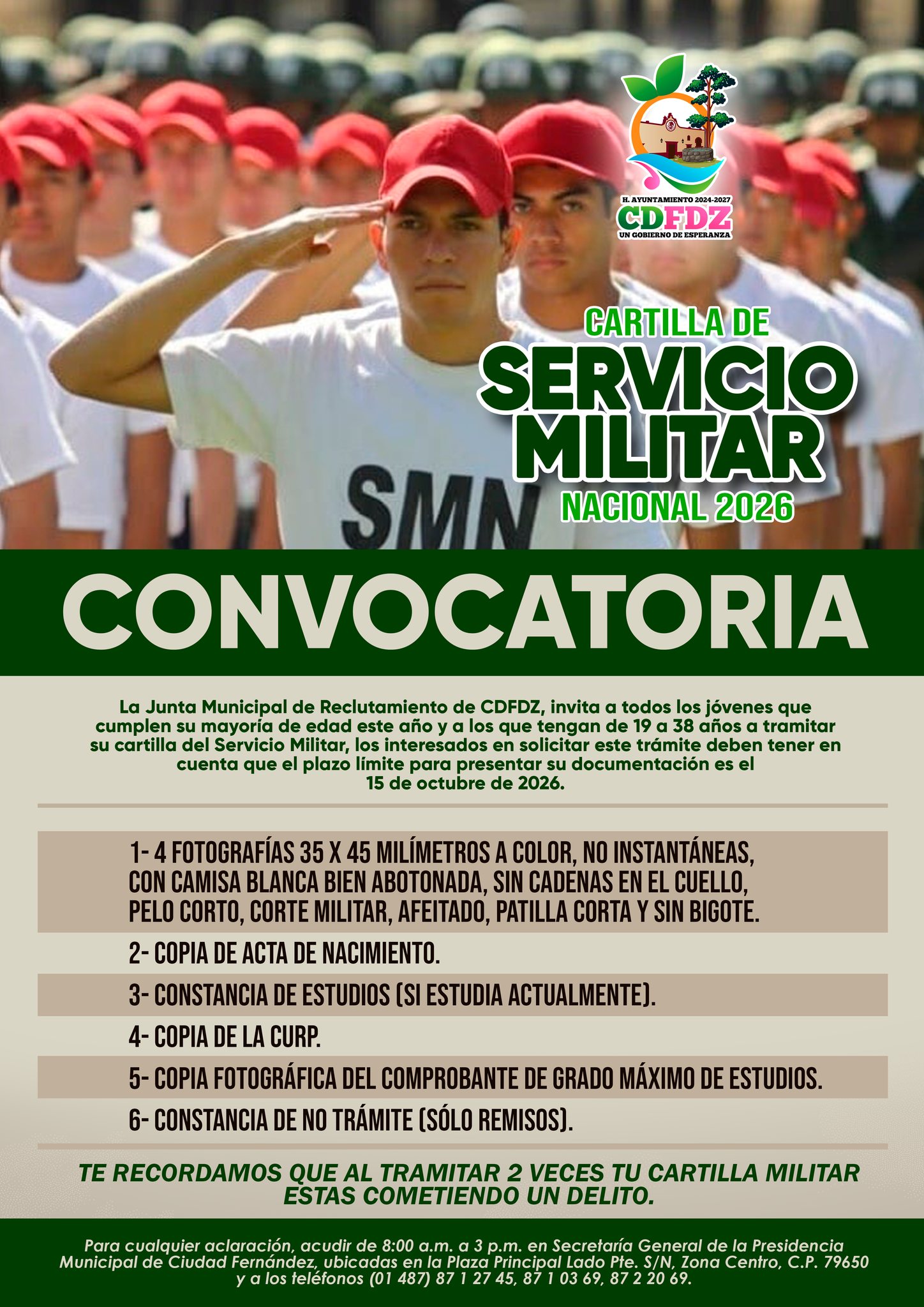 Secretaría GeneralConvocatoria Cartilla del Servicio Militar 2026 Comunicacion Social1 mes ago1 mes ago01 mins Navegación de entradas Previous: IMPULSANDO LOS DERECHOS DE LAS PERSONAS ADULTAS MAYORESNext: El presidente Rodolfo Loredo entregó a una pequeña su registro de doble nacionalidad